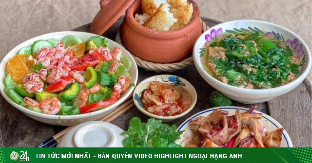 Salat tôm bơ rau củ – Mực nướng – Canh cua mồng tơi – Cơm cháy – Mắm dưa cà